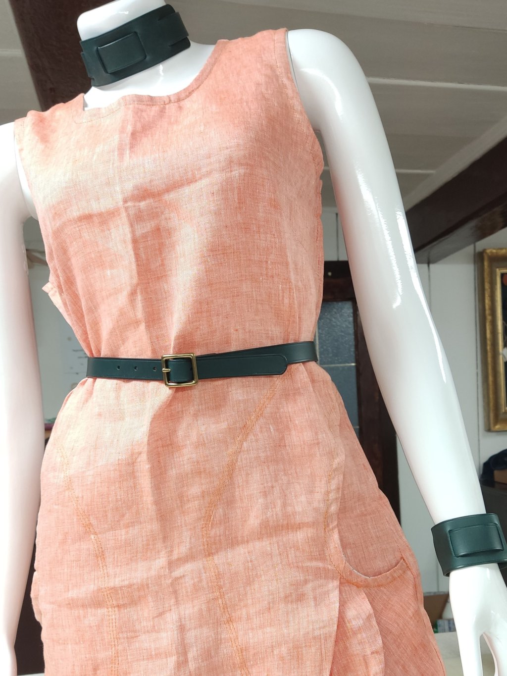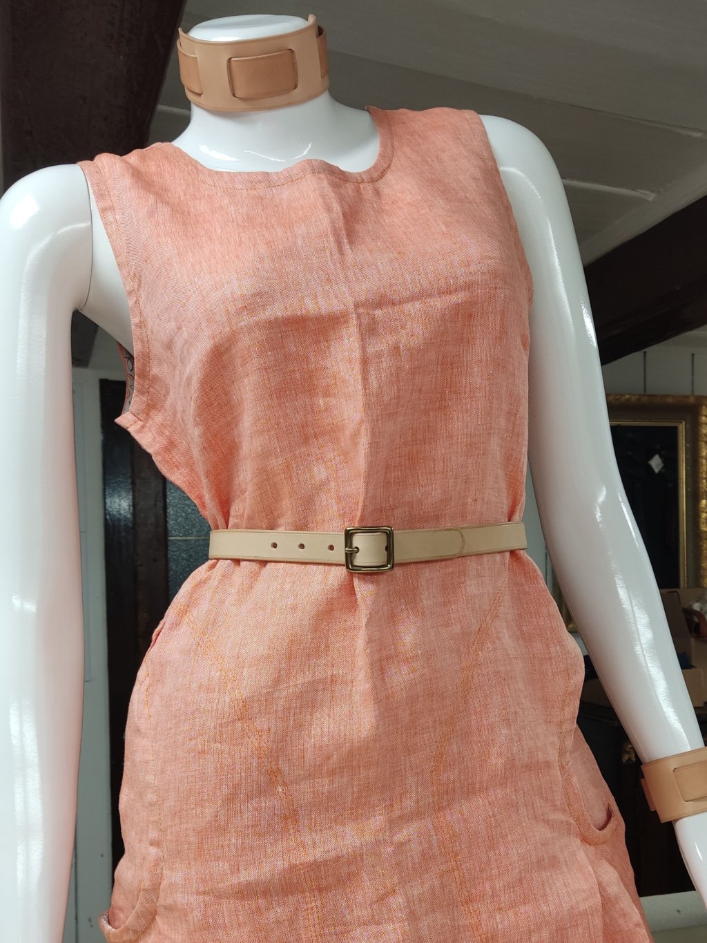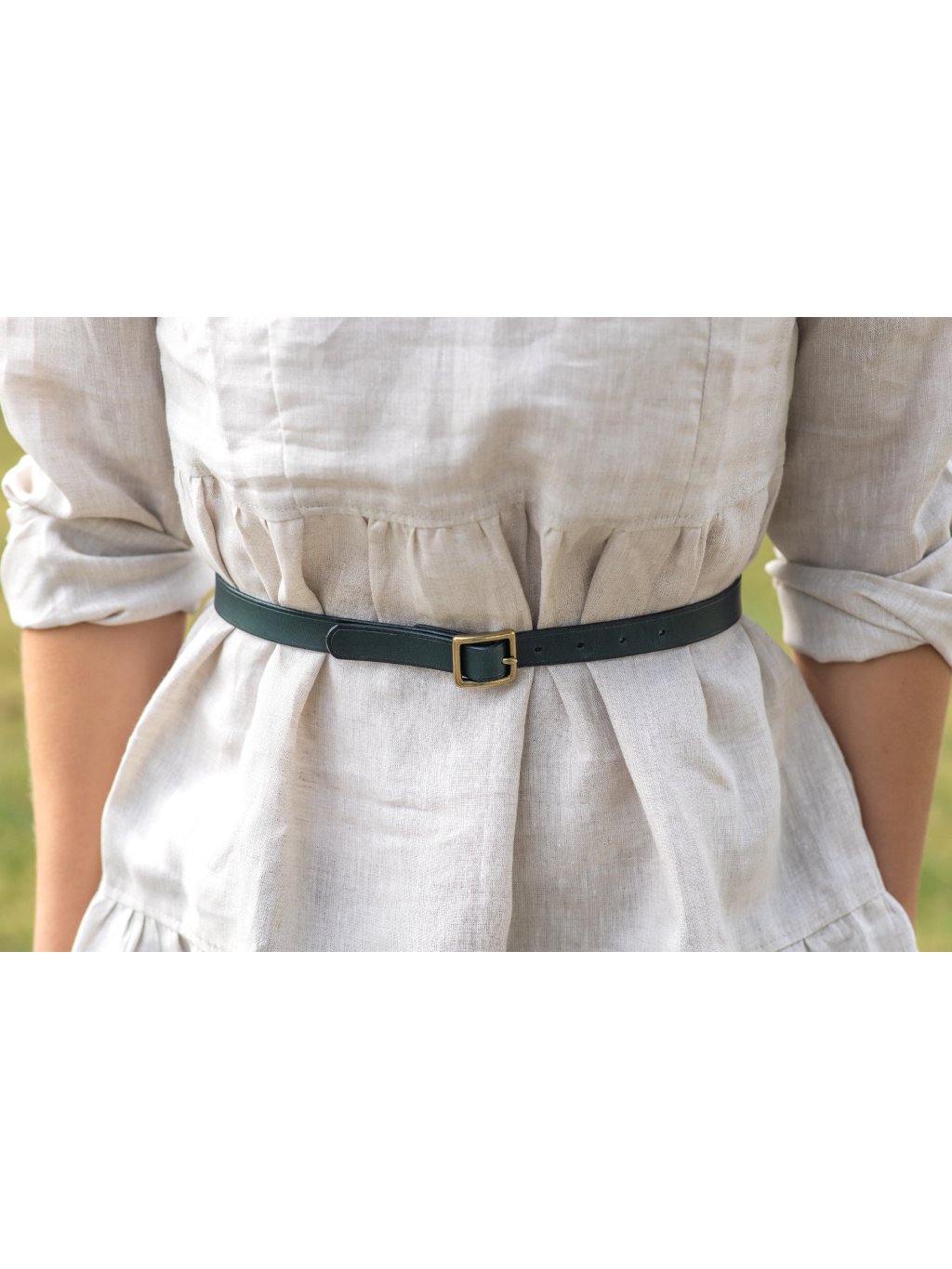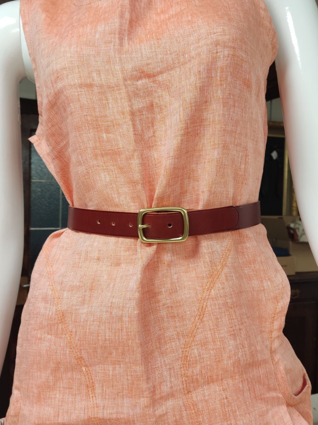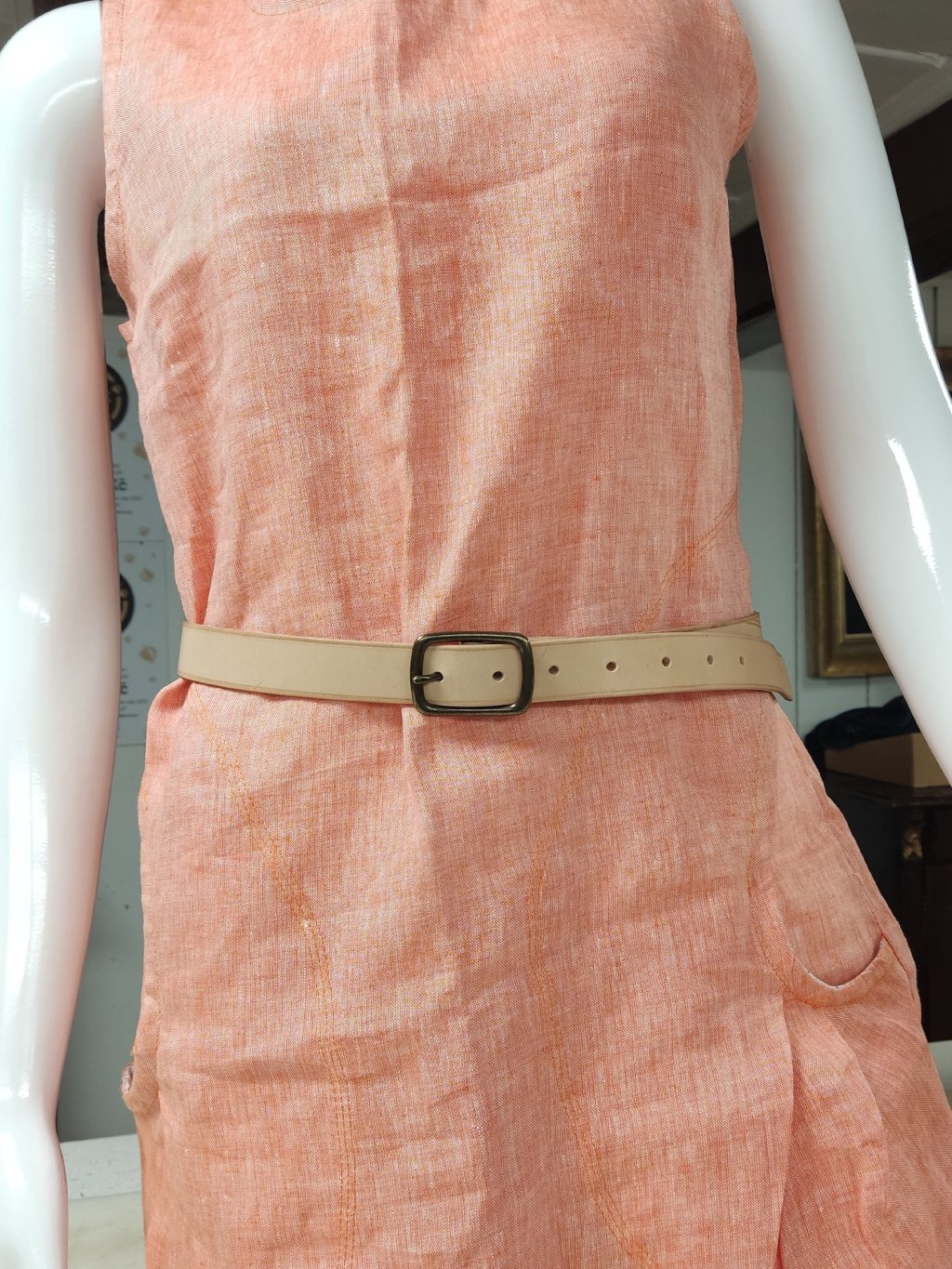KONSTRUKCE - opasek je z 2,5mm silné hovězí kůže. Je to tedy opasek na lehké nošení k šatům do pasu. Mosazná spona je poctivě ručně přišitá lněnou voskovanou nití sedlářským stehem francouzského typu. Razíme 5 dírek po 2 cm, tak máš dost prostoru na léto i Vánoce.